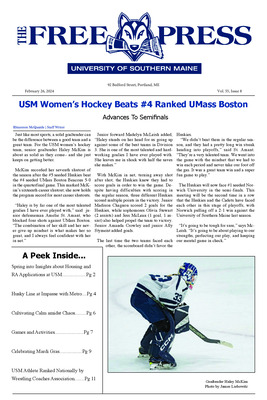 Students join fight for state park trees - Student police rehired to keep USM safe - Apathy towards Student Senate at all time low - WMPG elects new board members - Women's Center to open "feminist library" - Brown University professor proposes educational reforms - Opinion/Editorial - Art Scene - Chancellor says tuition likely to rise - Let's talk about sex, baby... - Social work intern helps refugees settle in - USM Huskies avenge early loss - Winning Huskies preparing for next round - Video games selling violence