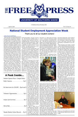Legislators rally support for budget PLAN B - IRATE Indian protestors disrupt Conference - USM celebrates environmental preservation on Earth Day - Women's Center focuses on awareness of sexual assault - ARA wins contract but is still far from perfect - WMPG station manager quits - Former USM student Jon Steen to be retried for rape - Senate gives $1,000 to budget rally - USM prof receives AARP grant - sexually oriented pinball machine causes stir - Intern students study the Portland Metro bus system - Graduate School tuition rises - Art Scene - How to lobby your legislators - UMO hit hard by $9 million in budget cuts - Student newspaper pushes limits at UNM - Pattenaude tells students to speak out - Phillies top in NL - Gagnon piles up awards - Fifield named to Olympic Festival staff