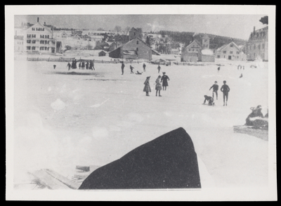 People playing on snowy field in Moosehead Lake region. Houses can be seen spotted in the background