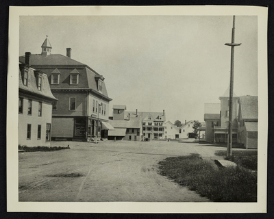 Noted on the back of the photograph: Greenville, Main St. -1900. The photograph shows a roadside view of a couple of houses, with the largest having four floors in the distance. There is a patch of grass on the right side of the frame.