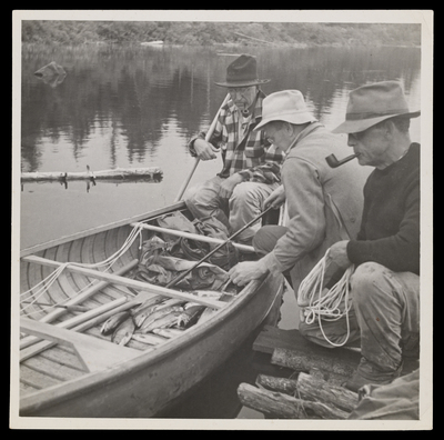 A photograph of three men processing fresh catch from a boat. Two men smoking pipe, and middle man is holding a rod. Handwritten on verso, Trout caught by […]