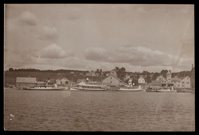 Five steamboats docked at coast line. Houses and estates are lined along the coast, and an open field on the center left of the frame.