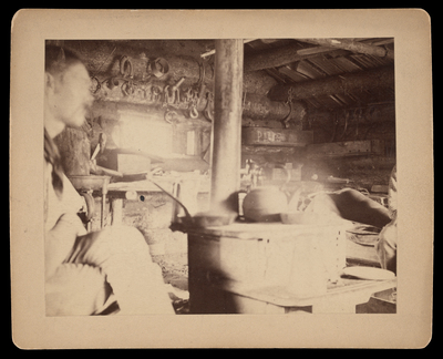 A man sitting on the left side of the frame next to wood burning stove. In the background, horse shoe repair tools can be spotted hanging.