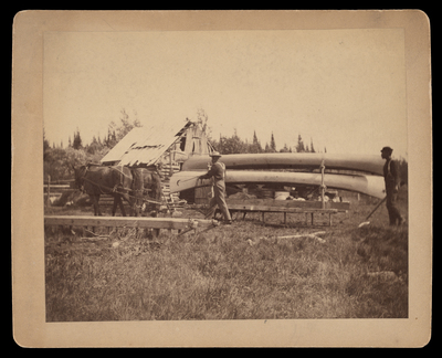 Two horses pull a carriage carrying two canoes. Two men supervise the pull.