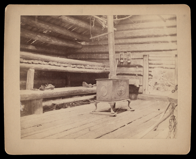 Ornate wood fired stove in the middle of a log cabin. Shoes are placed in a bench, and two lanterns hang beside a door frame