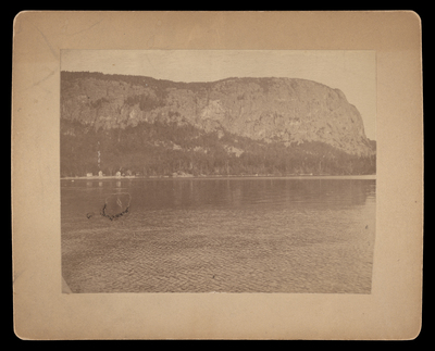 View of Mount Kineo from the center to the top half of the frame. Four houses can be seen along the shoreline.