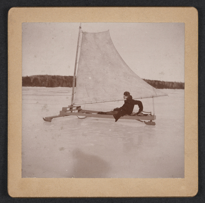 Photograph of a man navigating an ice sailing boat on a frozen lake.