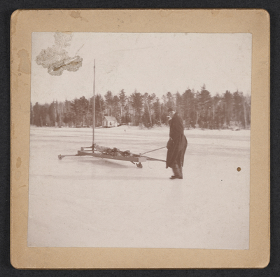 Photograph of a man navigating an ice sailing boat on a frozen lake.