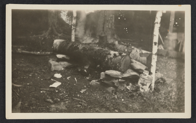 Pile pf logs and two cans in a woodland area