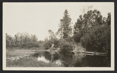 Man fly fishing on shore of a river, surrounded by green foliage