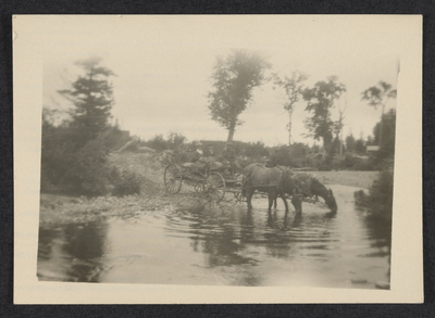 Two horses drinking from a passing river from a road. Passengers look to the camera.