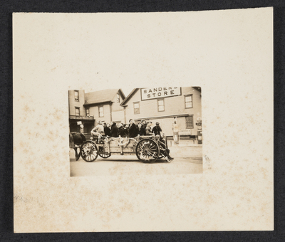 Photograph of a passenger loaded horse drawn wagon in front of the Sander's Store