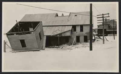 A demolition scene on a winter day, with snow on ground. Part of the old mill lay upside down beside the structure. The mill is positioned not too far from the electricity poles.