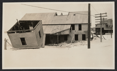 A demolition scene on a winter day, with snow on ground. Part of the old mill lay upside down beside the structure. The mill is positioned not too far from the electricity poles. Handwritten on verso: Mar, 1930, Started to tear down […]