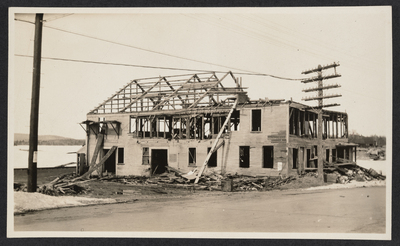 Mill's roof is skeletal. Snow appears to have thawed. Handwritten on verso: Mar, 1930 Town meeting day, started to tear down […] Known as Gower store 1845.