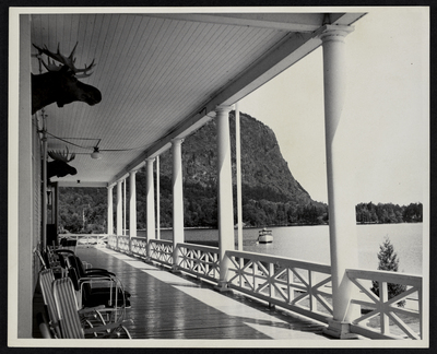 Mt.Kineo is seen in the background from a lodging's patio with two moose taxidermy suspended. A boat can be seen from the patio