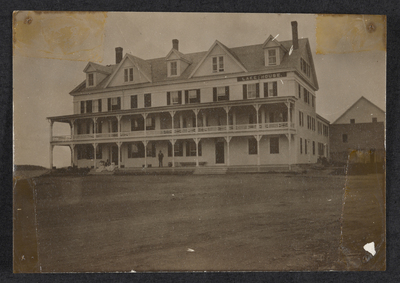 Women sit on the steps of Lake House, A four story inn. A man stand in the middle of the porch.