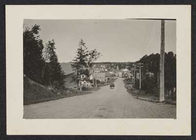 View of buildings at the end of wide road. Electricity poles line both sides of the road.