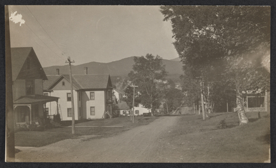 Houses sit on the left side of the road. Mountain views are visible ahead.