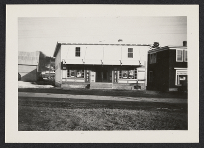 A view across the road of the first movie theater in Greenville, next to two buildings. A patch of snow is on the left side of the building.