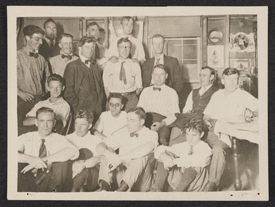 Group portrait of Seventeen men indoors. Stamped on verso: Harry Sanders the Real Estate Man Greenville, Maine.