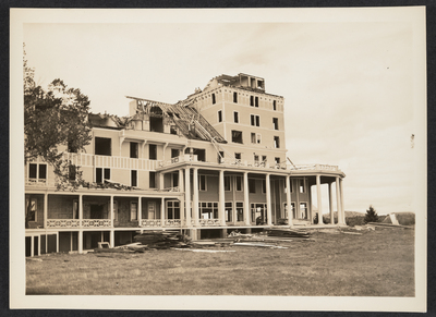 A side view showing the front terrace of Kineo house. Some wooden panels of the roof remain. Almost all windows have been removed from the second to the seventh floor. Stacks of wood panel cane be seen laying in front of the building.