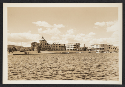 Another view of Kineo House, and the docks from Moosehead Lake. The center roof skeleton is still in tact. Clouds are visible in the background.