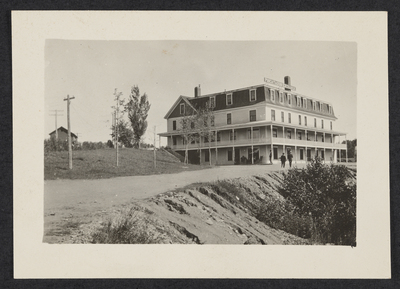 Photograph of a four story exchange building on the center to right side of the frame. Two men walk on the path leading the building. Three men sit on the patio.