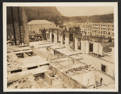A photograph of Kineo House's demolition taken from on-site. The roof is bare. Other buildings around Kineo House are unscathed. Lower bottom of Mount Kineo is in the left center of the frame.