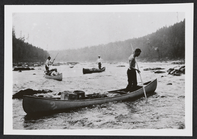 Three men Poling on the river. The river curves left along the tree lines on both sides.