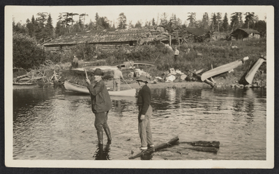 On a raft and in a canoe in front of Sanders and Cullen's winter lumber camp, Moosehead Lake, ca. 1920's