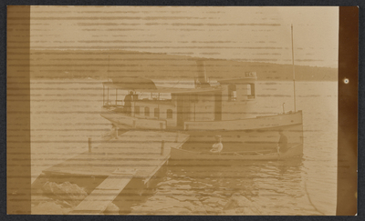 Sepia photograph of a docked small ferry, next to the ferry is a small canoe with a man and a woman sitting in front.
