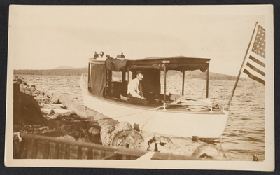 A man sits on a ferry boat with an American flag posted at the bow. The ferry boat is docked next to a long log.
