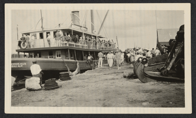 Ferry steamboat is full of passengers boarding, and unloading on a sandy harbor.