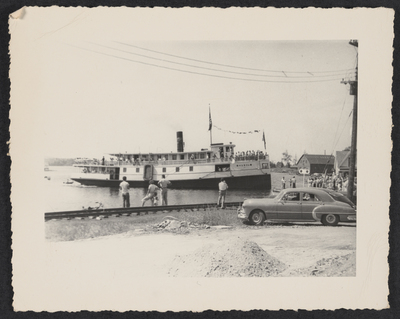 A steam ferry leaving dock. Railroad tracks are beside dock where people stand to observe the departing ferry. Two automobiles are parked next to railroad tracks.