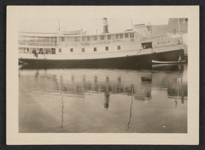 A ferry docked is reflected on calm water. A small boat is docked next to the ferry on the far right of the frame. Handwritten on verso, " The Kate 1927"