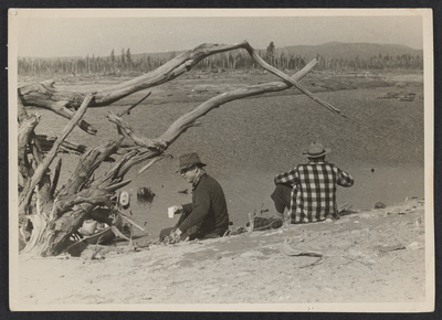 Two fishermen sit on shore next to a dry tree, with a boat docked under the tree. Men are seen drinking possibly tea.