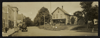 Panoramic view of shops lined on the left side of the frame. Centered on the left is an ice cream shop, Hiscock's Ice Cream. A homestead is positioned on the right ride of the frame. Two auto mobiles are parked on the side road.