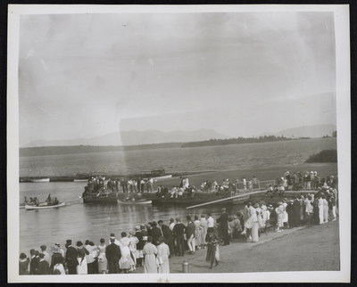 People gather around pier and shore to watch departing boats from Moosehead Lake.