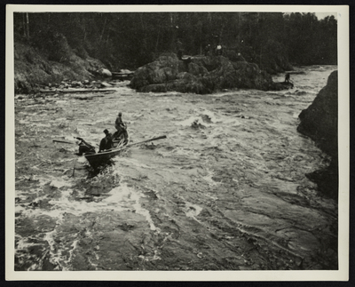 Men on a boat fighting the rushing river water. A group of men stand on a small cliff in the middle of the river, possibly fishing