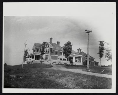 A photograph looking up to Shaw House from downhill. Electricity poles can be seen in framing the Inn.