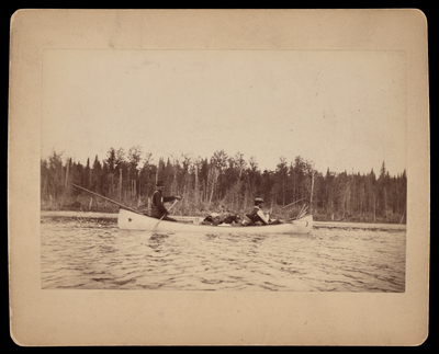 Two men on a canoe in the center of a frame. The photograph appears to be taken by a another passing boat